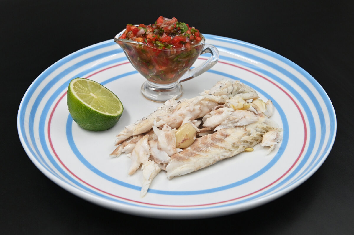 При подаче рыбу полейте водкой и аккуратно подожгите — это эффектное завершение блюда. Подавайте с соусом пико-де-гайо.