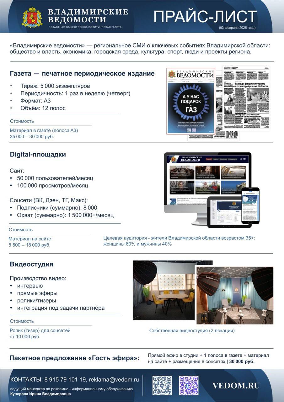«Владимирские ведомости» предлагают эффективные инструменты для продвижения вашего бизнеса и проектов. Мы рассказываем о ключевых событиях Владимирской области в печатном издании, на сайте и в социальных сетях.
