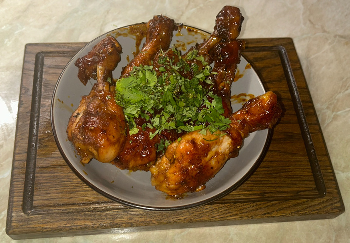 После завершения приготовления выложите курицу на тарелку, посыпьте свежей кинзой, и ваше блюдо готово к подаче. Этот замечательный рецепт отлично подходит как для куриных ножек, так и для других частей курицы: крыльев или бедер.