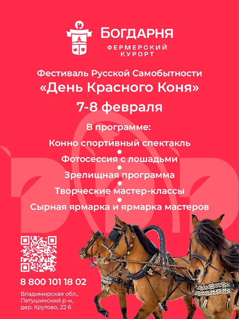 7 и 8 февраля Петушинский район приглашает на День Красного Коня в деревне Крутово. Программа очень насыщенная: Сырная Ярмарка, конно-трюкового шоу Русь изначальная, выставка Наследие Саровского старца, экскурсия по усадьбе, творческие мастер-классы, фотосессии, вечерняя программа и многое другое.