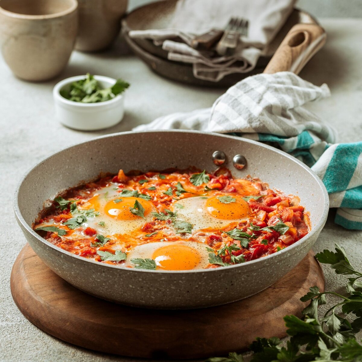 Помидоры с луком создают яркий, насыщенный профиль: лук до готовности, затем добавляют помидор без кожицы, и только после их смягчения отправляются яйца. Так блюдо получается не только красивым, но и очень ароматным.