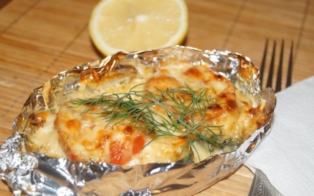 Когда рыба подрумянится, вытаскивать из духовки и подавать к столу, украсив зеленью. Удобно подавать рыбку прямо в фольге — это не только оригинально, но и позволяет сохранить все соки внутри. При желании сверху можно добавить немного лимонного сока, чтобы подчеркнуть вкус.