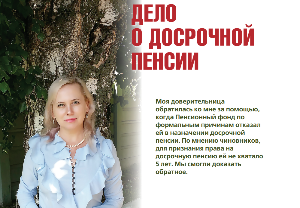 Эта нелегкая борьба помогла Наталье достичь своей цели, и её пенсия была назначена. Сложности дел о досрочных пенсиях не останавливают желающих занимающихся этой юридической областью, ведь каждое успешное решение приносит искреннюю благодарность и удовлетворение.