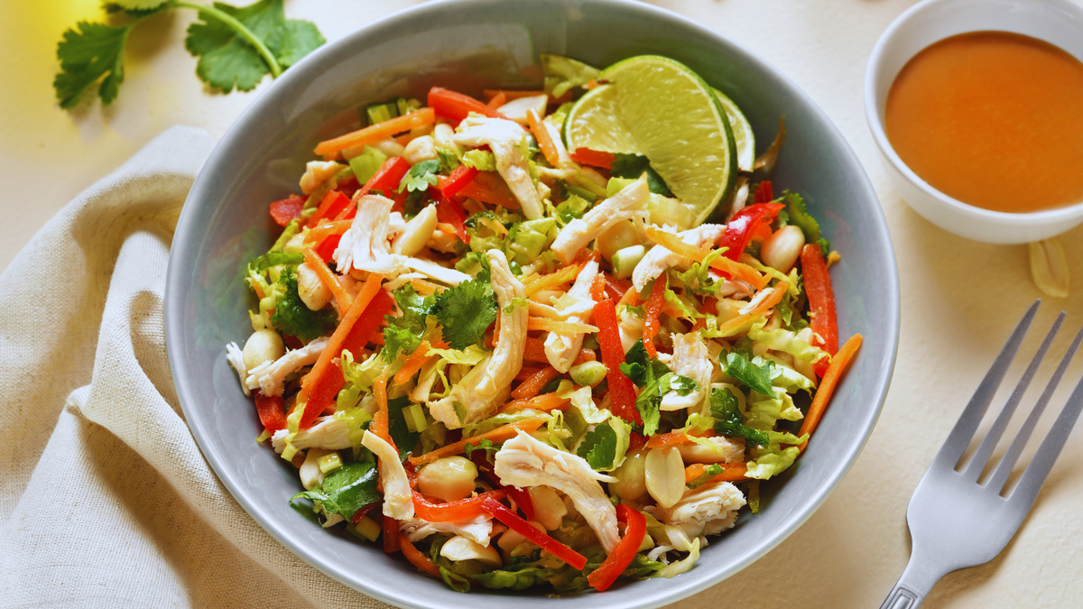 На столе темно-зеленые листья салата, яркие кусочки перца и нежная куриная грудка, щедро политая насыщенной заправкой. Этот китайский куриный салат – это идеальное сочетание свежести и неповторимого вкуса, которое так привлекает гурманов.