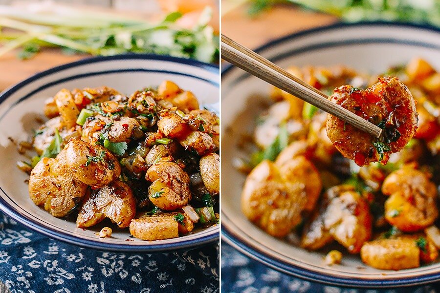 • Вернуть картофель в сковороду, добавить соевый соус, сахар, молотую зиру, столовую ложку воды, кунжутное масло и, если хотите, хлопья чили. Осторожно перемешать, чтобы картофель равномерно покрылась специями. Посолить по вкусу.