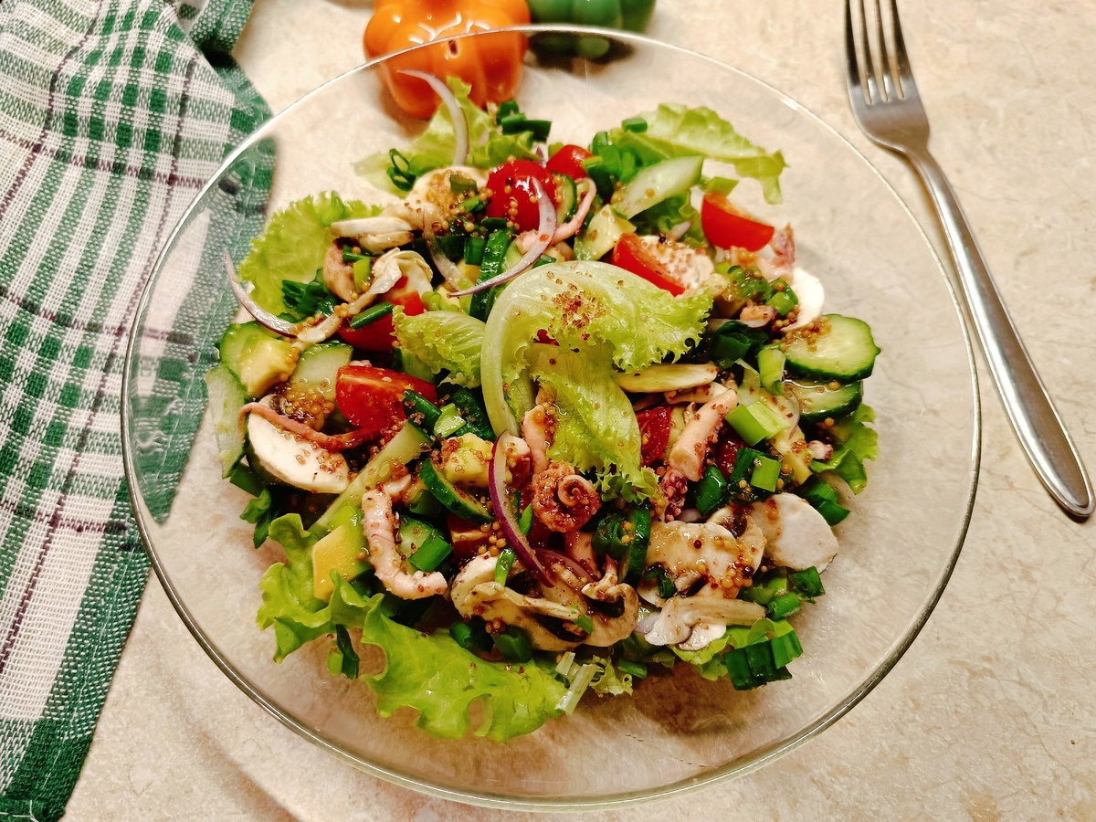 Для заправки смешайте растительное масло, мед, соевый соус, уксус и горчицу. Готовую заправку соедините с овощами и кальмарами, добавляя соль и перец по вкусу. Перемешайте тщательно.