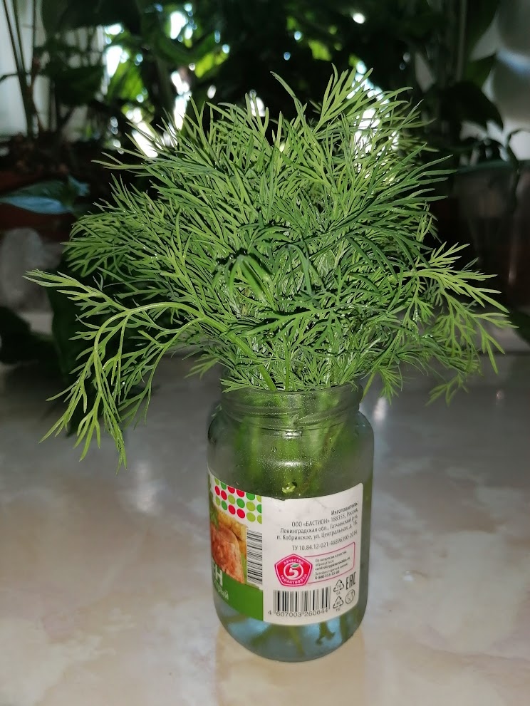 Свежую зелень, такую как петрушку и укроп, можно сохранить в баночке с водой, прикрыв сверху пакетом. Это поможет зелени оставаться свежей до недели и дольше.