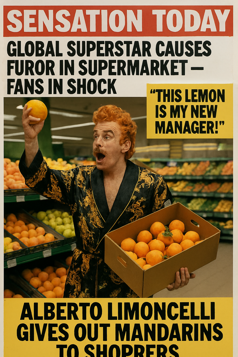 Сегодня в Солнечном Маркете разразилась настоящая сенсация! Легенда средств массовой информации, Альберто Лимончелли, вновь привлек внимание общественности своим необычным поведением и ярким стилем. Артист, известный своей эксцентричностью и любовью к цитрусовым плодам, появился в магазине в весьма неожиданном наряде.