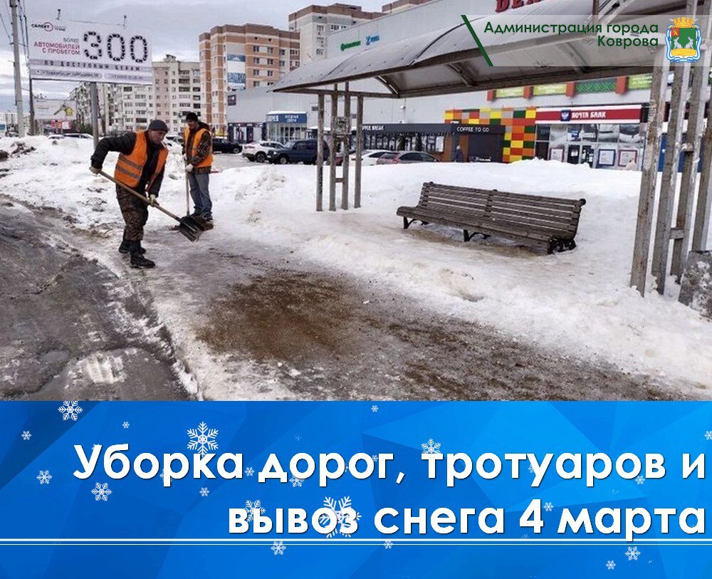 Сегодня, 4 марта, в ночные и утренние часы проводилась очистка гидрантов, остановочных пунктов на пр. Ленина, ливнёвок на ул. Южной, ул. Лопатина, ул. Димитрова. Почищена дорога к детским садам на ул. Абельмана, д.139/2, ул. Никитина, д.35, а также дорога в Ковров-8. Вывезен снег с ул. Либерецкой (в районе "Тысячника"), ул. Маяковского на участке от ул. Грибоедова до ул.Тургенева. Проведена очистка тротуара на ул. Т.Павловского. Осуществлялась посыпка дорог песко-соляной смесью на ул. Комсомольской, пр. Ленина, ул. Дегтярева, ул. Еловой, ул. Строителей.