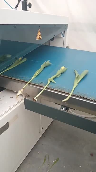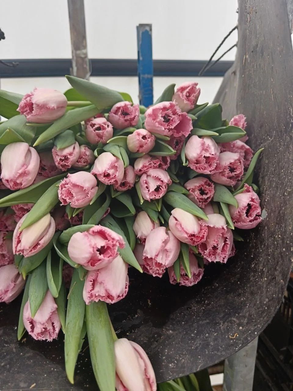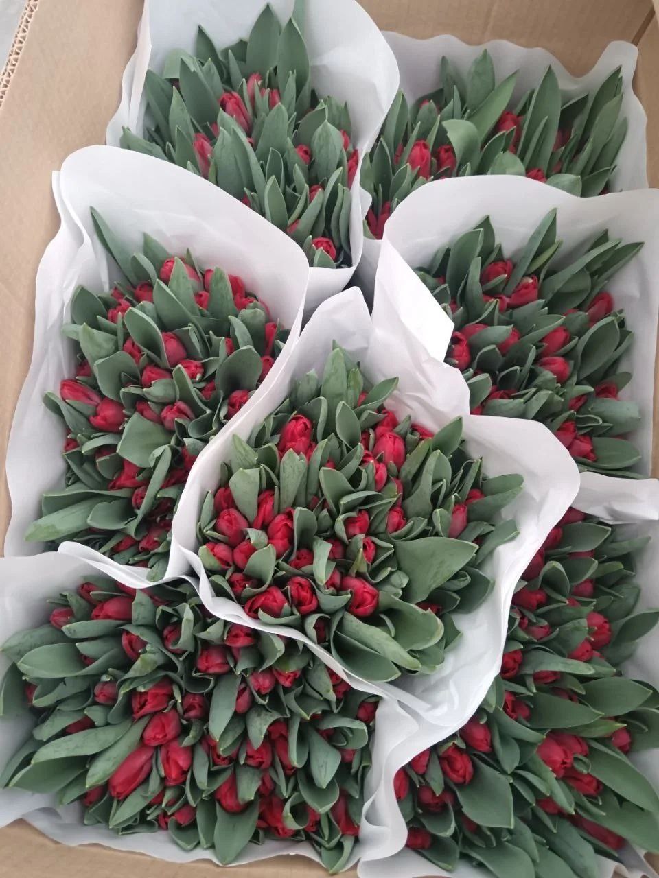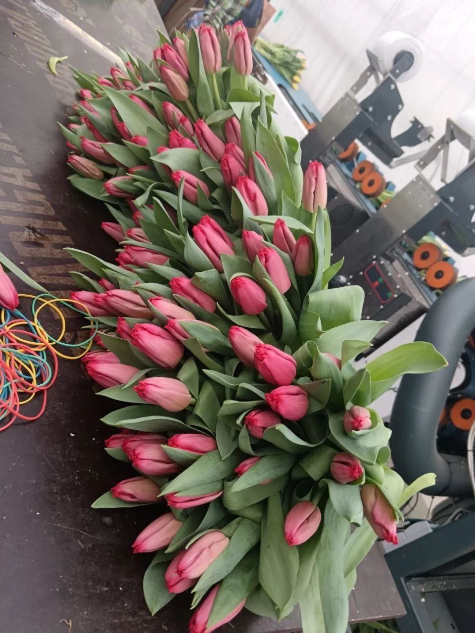 Коротко расскажем: цветы срезают рано утром — аккуратно укладывают на конвейерную ленту — тюльпаны распределяют по цветам и сортам — сборка банчей (пачка растений одного вида, сорта, цвета) — обертывание в дышащую крафтбумагу — финальная упаковка в жёсткие картонные коробки с вентиляционными отверстиями — холодное хранение (+1°C) для свежести и долгой жизни.