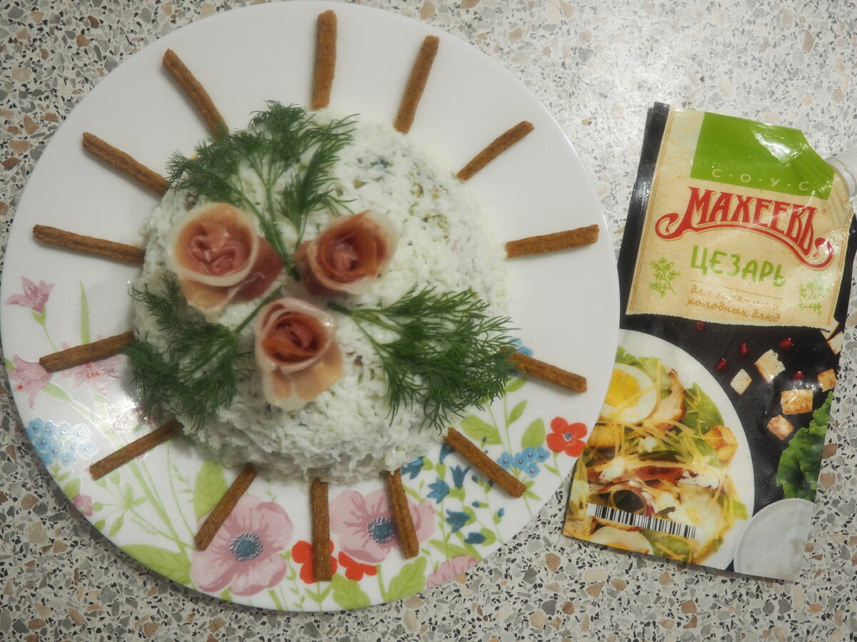- И, конечно, немного майонеза — для этого рецепта идеально подойдёт соус «Цезарь» от «МахеевЪ»