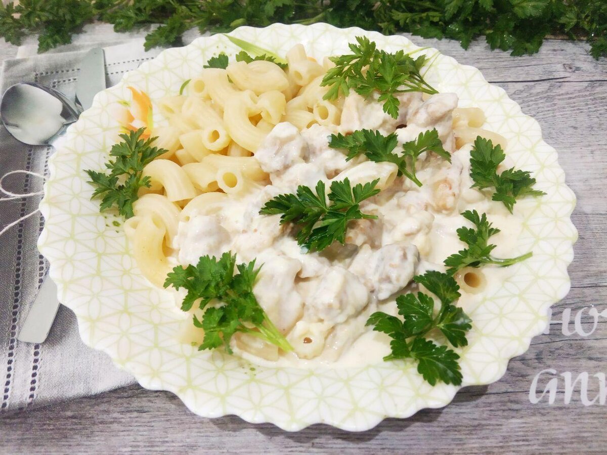 Соус подается с горячими макаронами или можно разогреть перед самой подачей. Не забудьте украсить блюдо свежей зеленью на ваше усмотрение.