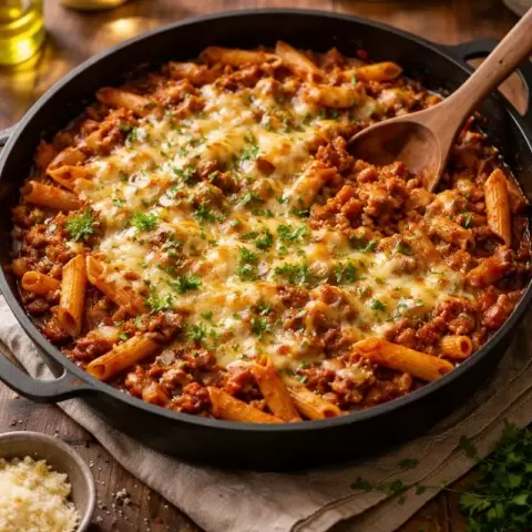 - Ленивая паста в томатном соусе: 250 г макарон, 300 г фарша, 2 ст. ложки томатной пасты (или стакан перетертых томатов), вода до уровня макарон, 100 г сыра, 2 зубчика чеснока.