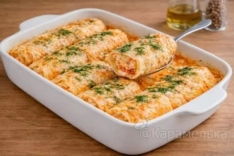 7. Залить соусом голубцы и запекать в духовке при 180 градусах около 40-50 минут, пока капуста не станет мягкой и не появится румяная корочка.