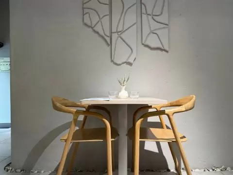 Пространство бистро делится на два небольших зала — один с открытой кухней и баром, второй — с уединительными столиками и необычными элементами декора. В интерьер внедрен естественный стиль, где каждая деталь плавно переходит в другую. Мягкие оттенки позволяют гостям сосредоточиться на еды и общении, что идеально подходит для встреч с друзьями или романтических ужинов.