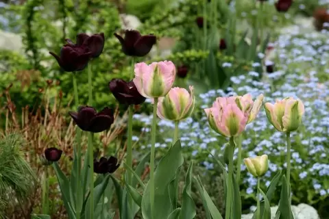 Альтернативой сплошной посадке может стать совместная посадка луковичных с двулетниками, такими как виола или незабудка. Пользуясь этим приемом, садоводы могут отсрочить выкопку луковичных растений, поскольку двулетники дольше сохраняют свои цветы. При этом важно уменьшить норму посадки луковиц до 20–25 штук на квадратный метр, оставив пространство для других растений.
