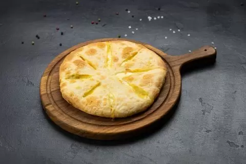 Этот хачапури — классика западной Грузии, круглая лепешка с нежной имеретинской сырной начинкой, заключённой между двумя слоями теста. Изготавливается на основе мацони, что придаёт тесту лёгкую кислинку и уникальную текстуру.