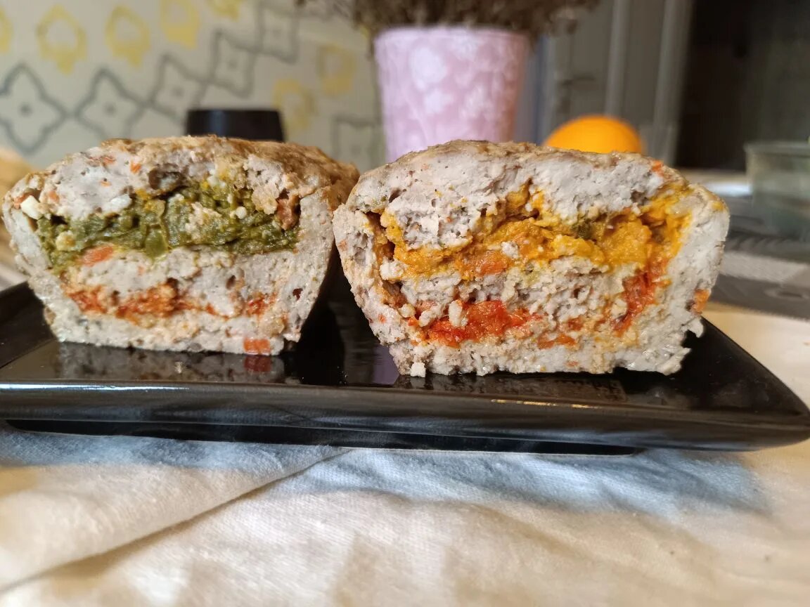 Шаг 3: В форме для запекания разместить часть фарша, формируя дно и стенки «буханки». В середину выложить слой перечного пюре, закрывать его мясным слоем. Повторить для каждого цвета перца, пока не закончится фарш.