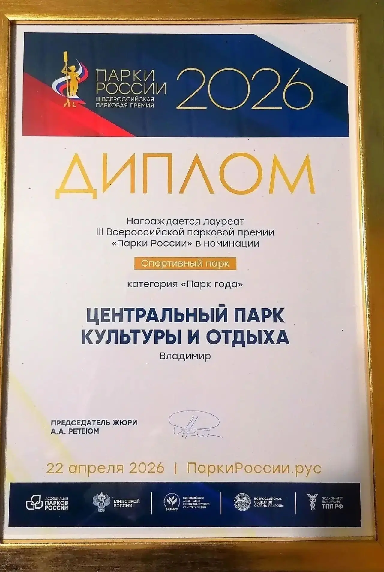 Центральный парк культуры и отдыха города Владимира вошел в ТОП-4 лучших парков России на самой престижной Всероссийской парковой премии «Парки России» и получил почетный статус «Лауреат Премии».